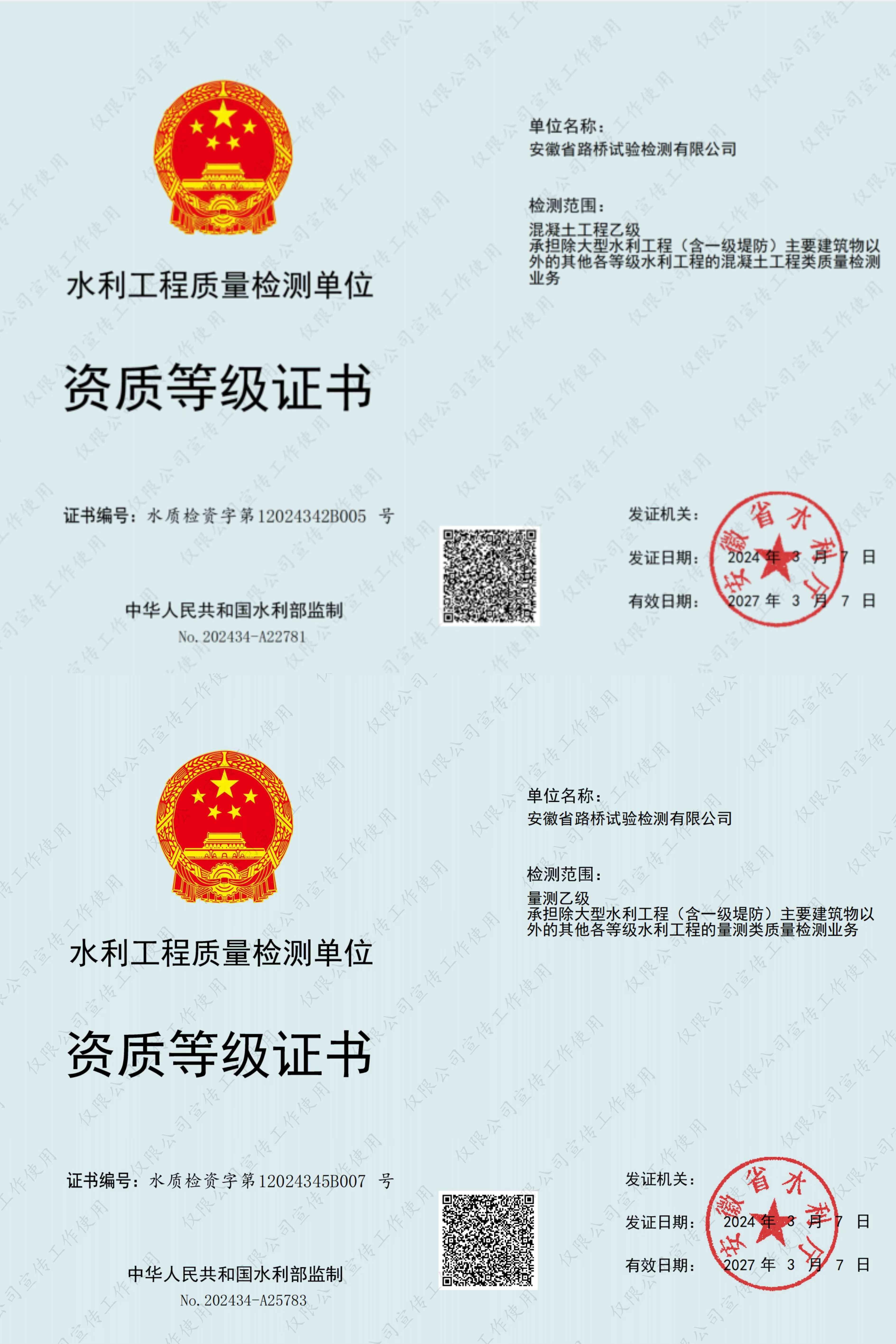 安徽省路橋試驗(yàn)檢測有限公司順利通過四項(xiàng)水利工程質(zhì)量檢測乙級資質(zhì)延續(xù)