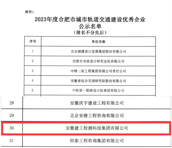 安徽建工檢測(cè)科技集團(tuán)有限公司榮獲2023年度合肥市城市軌道交通建設(shè)“優(yōu)秀企業(yè)”稱(chēng)號(hào)