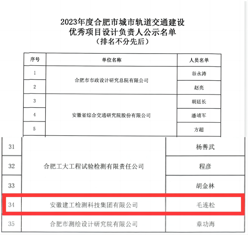 近日,合肥市城市軌道交通協(xié)會(huì)下發(fā)《關(guān)于表彰2023年度合肥市城市軌道交通建設(shè)的優(yōu)秀企業(yè)和優(yōu)秀項(xiàng)目經(jīng)理名單的通知》文件,安徽建工檢測(cè)科技集團(tuán)有限公司被授予“優(yōu)秀企業(yè)”稱(chēng)號(hào),毛連松同志榮獲“優(yōu)秀項(xiàng)目經(jīng)理”榮譽(yù)稱(chēng)號(hào)。這是建工檢測(cè)第三次獲此“優(yōu)秀企業(yè)”榮譽(yù)稱(chēng)號(hào)。