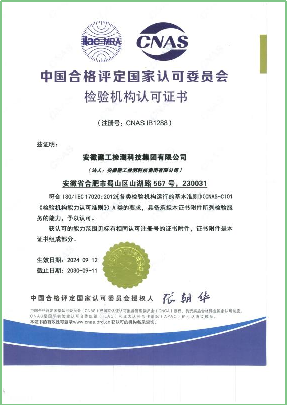 近日,安徽建工檢測(cè)科技集團(tuán)有限公司順利通過(guò)中國(guó)合格評(píng)定國(guó)家認(rèn)可委員會(huì)(CNAS)評(píng)定,獲得檢驗(yàn)機(jī)構(gòu)認(rèn)可證書(shū)(注冊(cè)號(hào):CNAS IB1288),為安徽住建領(lǐng)域首家獲證機(jī)構(gòu),同時(shí)成為具備CNAS雙證認(rèn)可(CNAS實(shí)驗(yàn)室認(rèn)可和CNAS檢驗(yàn)機(jī)構(gòu)認(rèn)可)的檢驗(yàn)檢測(cè)機(jī)構(gòu)。