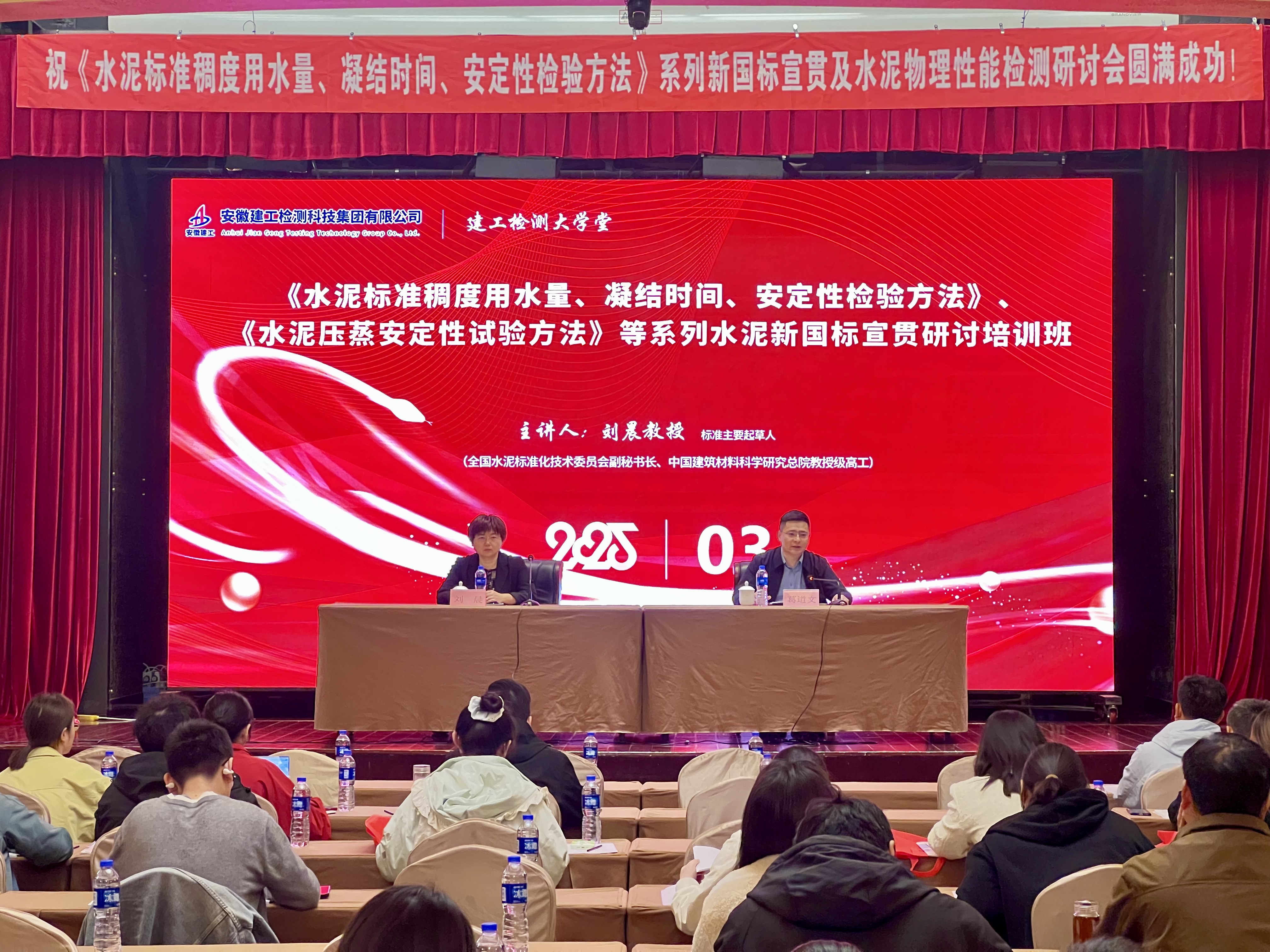 3月24日上午,“建工檢測大學(xué)堂”2025年度第一期:《水泥標(biāo)準(zhǔn)稠度用水量、凝結(jié)時(shí)間、安定性檢驗(yàn)方法》《水泥壓蒸安定性試驗(yàn)方法》等系列水泥新國標(biāo)宣貫研討培訓(xùn)班正式開班。建工檢測黨委委員、副總經(jīng)理、總工程師葛道文主持開班儀式。