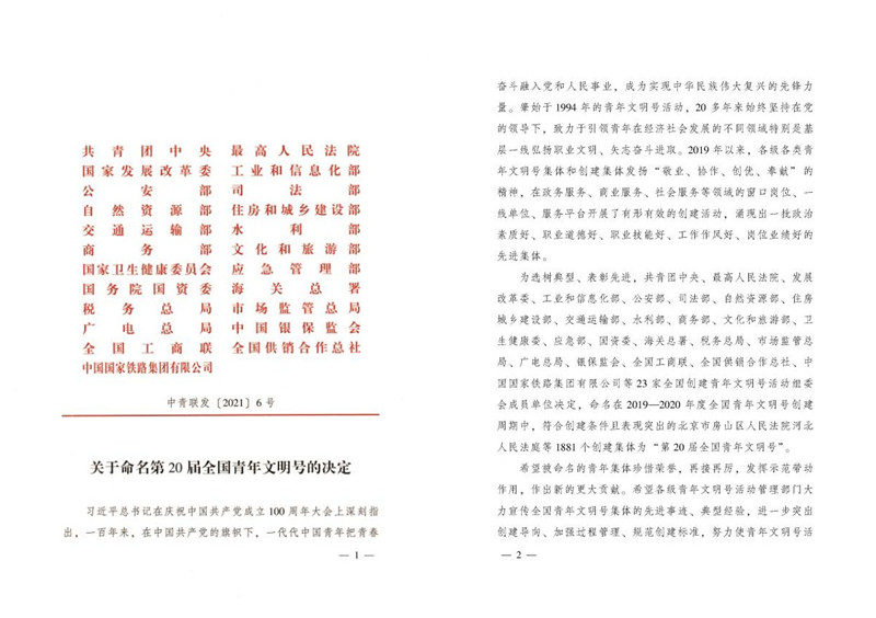 此次命名表彰由共青團(tuán)中央、最高人民法院、發(fā)展改革委、工業(yè)和信息化部、公安部等23家全國創(chuàng)建青年文明號活動組委會成員單位開展,經(jīng)綜合考察、逐級推報、集中審核、社會公示等程序評選產(chǎn)生。