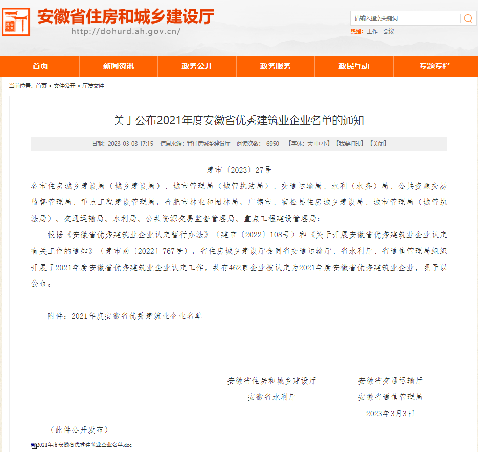 近日,省住房和城鄉(xiāng)建設(shè)廳公布“2021年度安徽省優(yōu)秀建筑業(yè)企業(yè)”名單,二站喜獲建筑工程-工程質(zhì)量檢測(cè)類“2021年度安徽省優(yōu)秀建筑業(yè)企業(yè)”稱號(hào)。